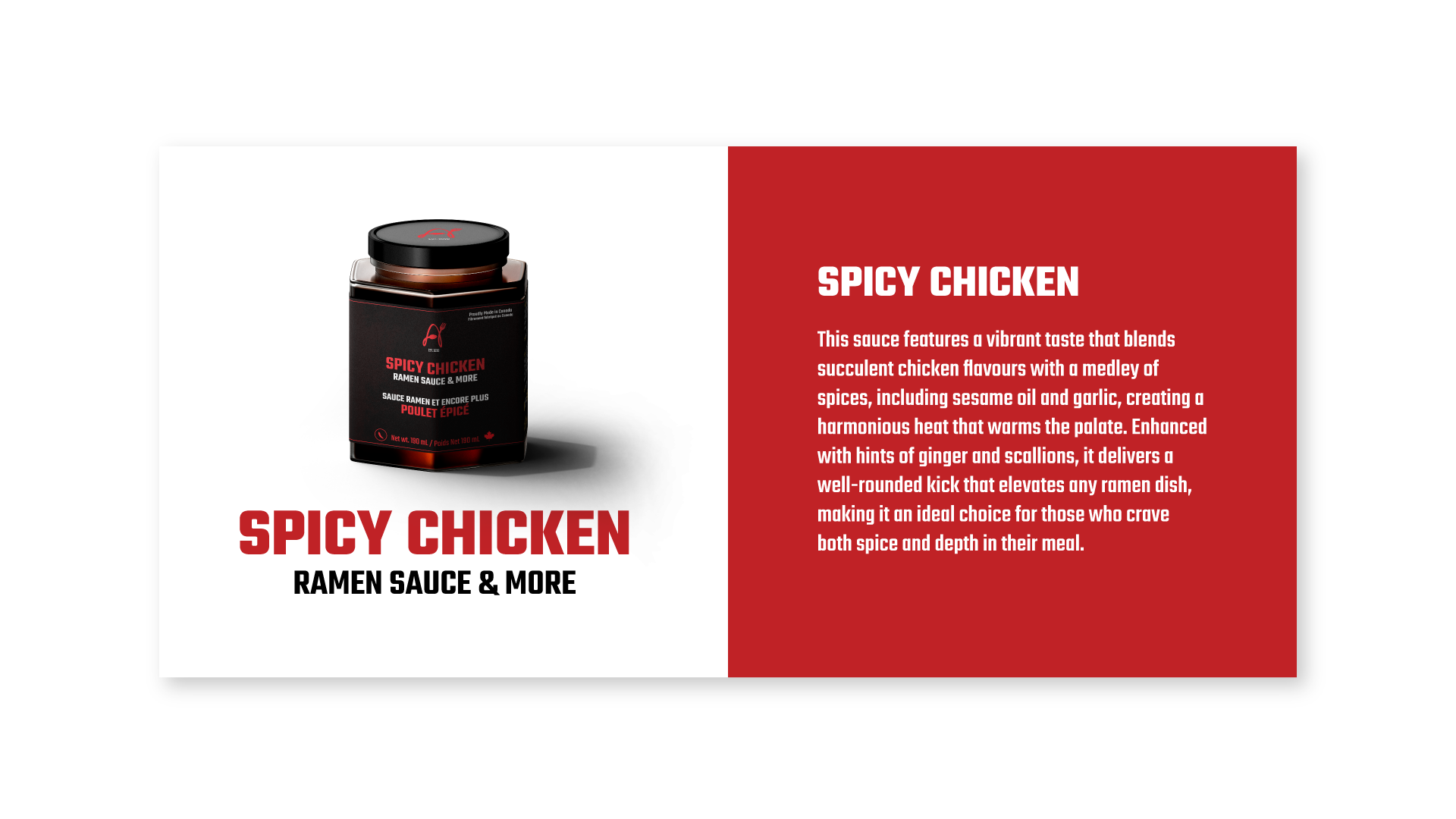 Picked up the spicy chicken sauce after sampling at The Hespeler Market and it's so good! Tried it in noodle soup, topped off chili and also just on plain green beans. Will definitely be buying more!"